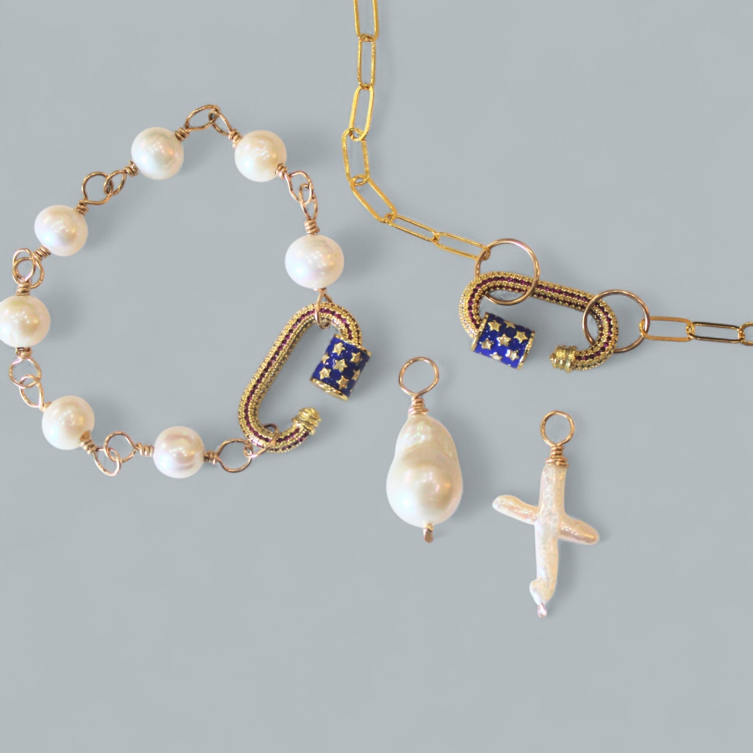 Cool, curated collection featuring freshwater pearls, polished gold, and coastal hued gemstones.