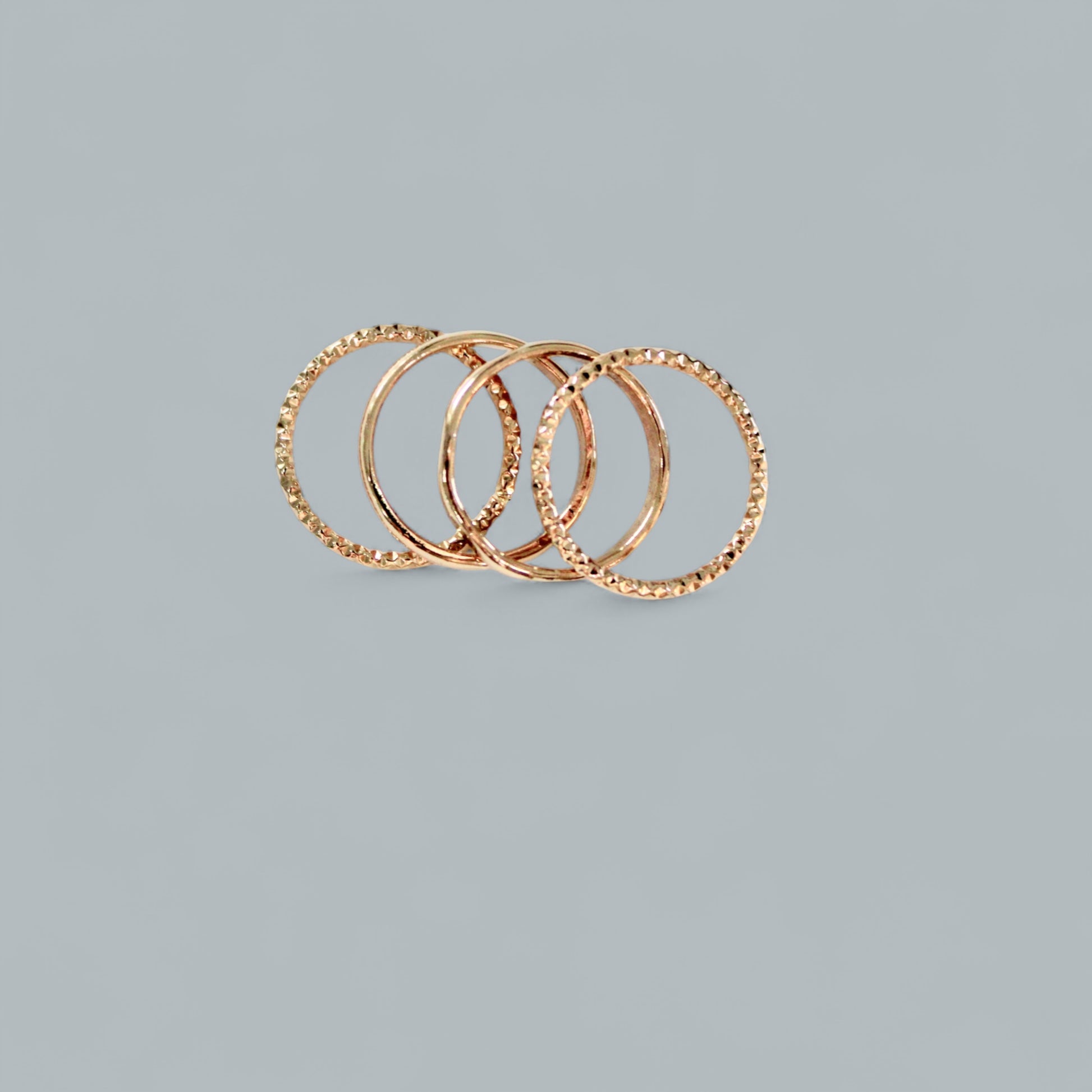 2 sparkle bands, one plain smooth 3mm band, and one hammered 3mm band all crafted in our quality 14k gold filled wire make up this favorite ring stack!