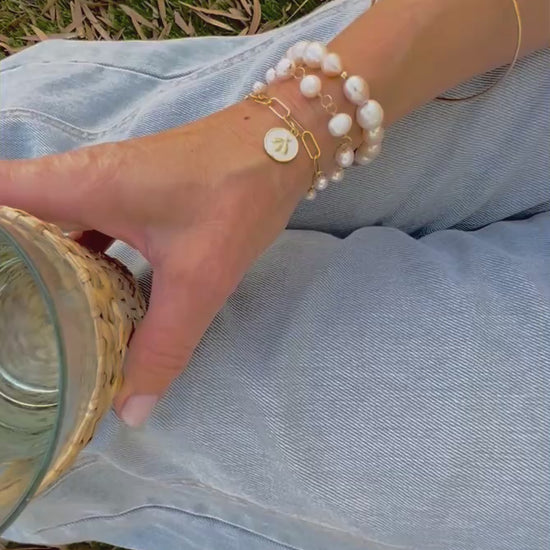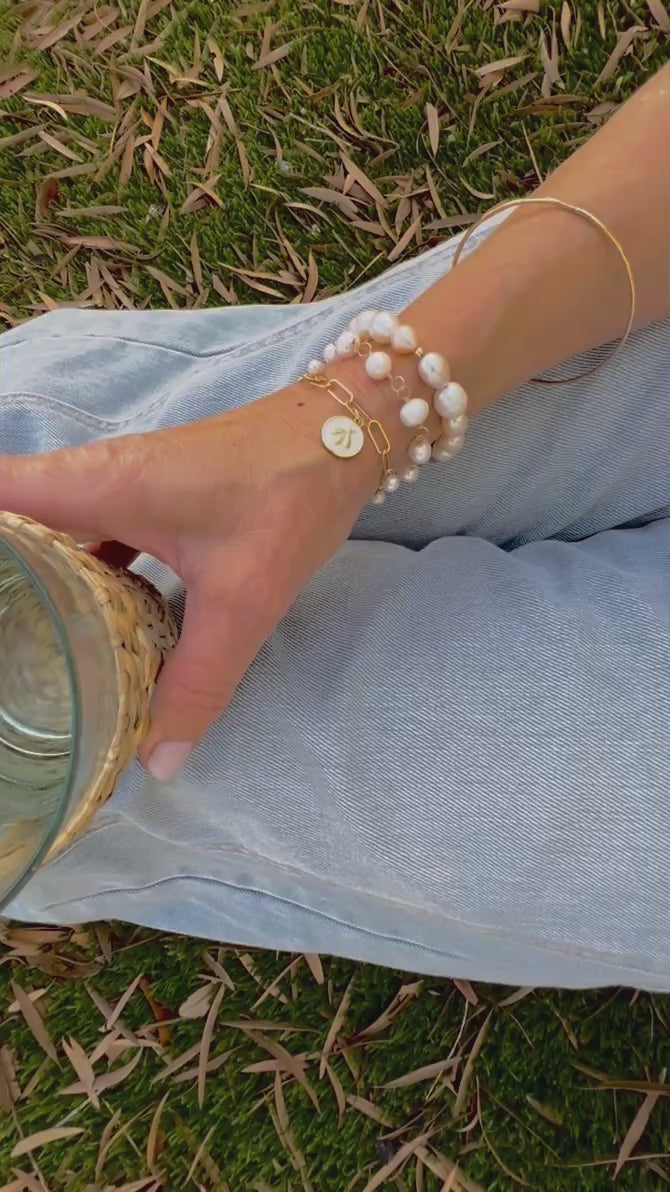 Stunning AAA pearl charms are paired with a sweet enameled bee charm and linked to large 14k gold filled paperclip chain.