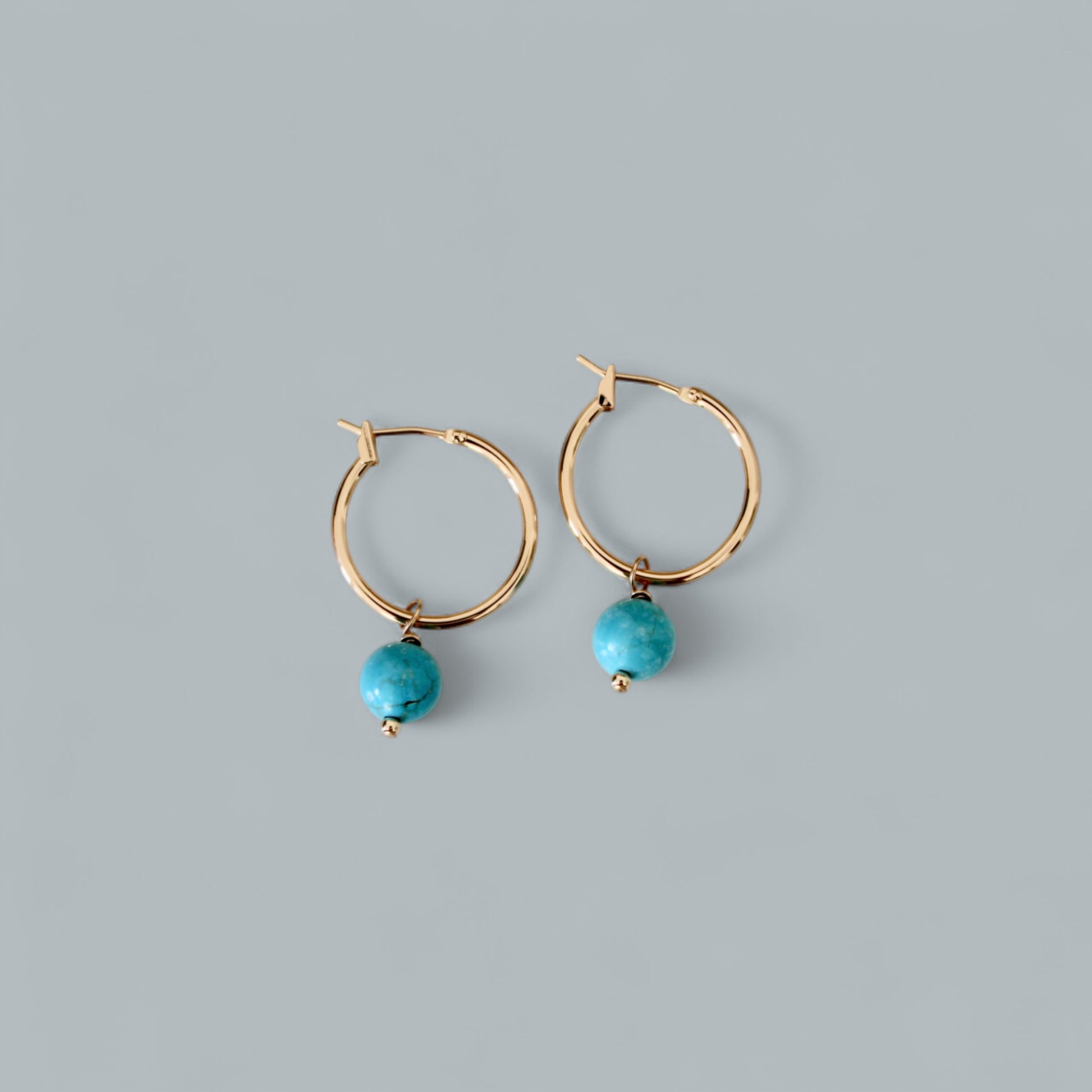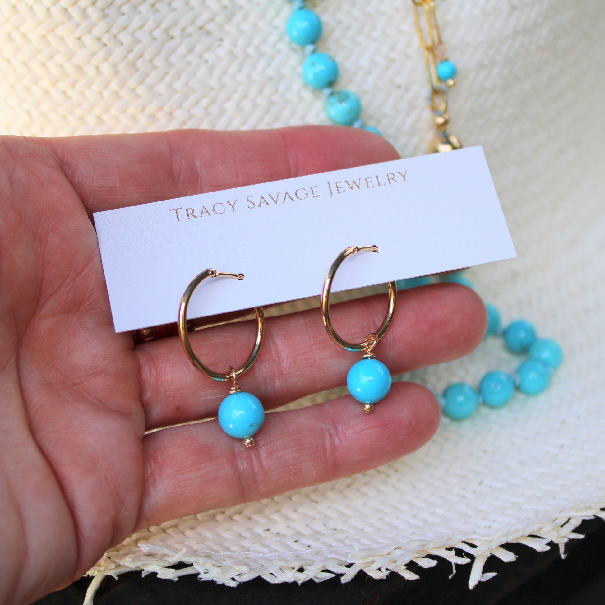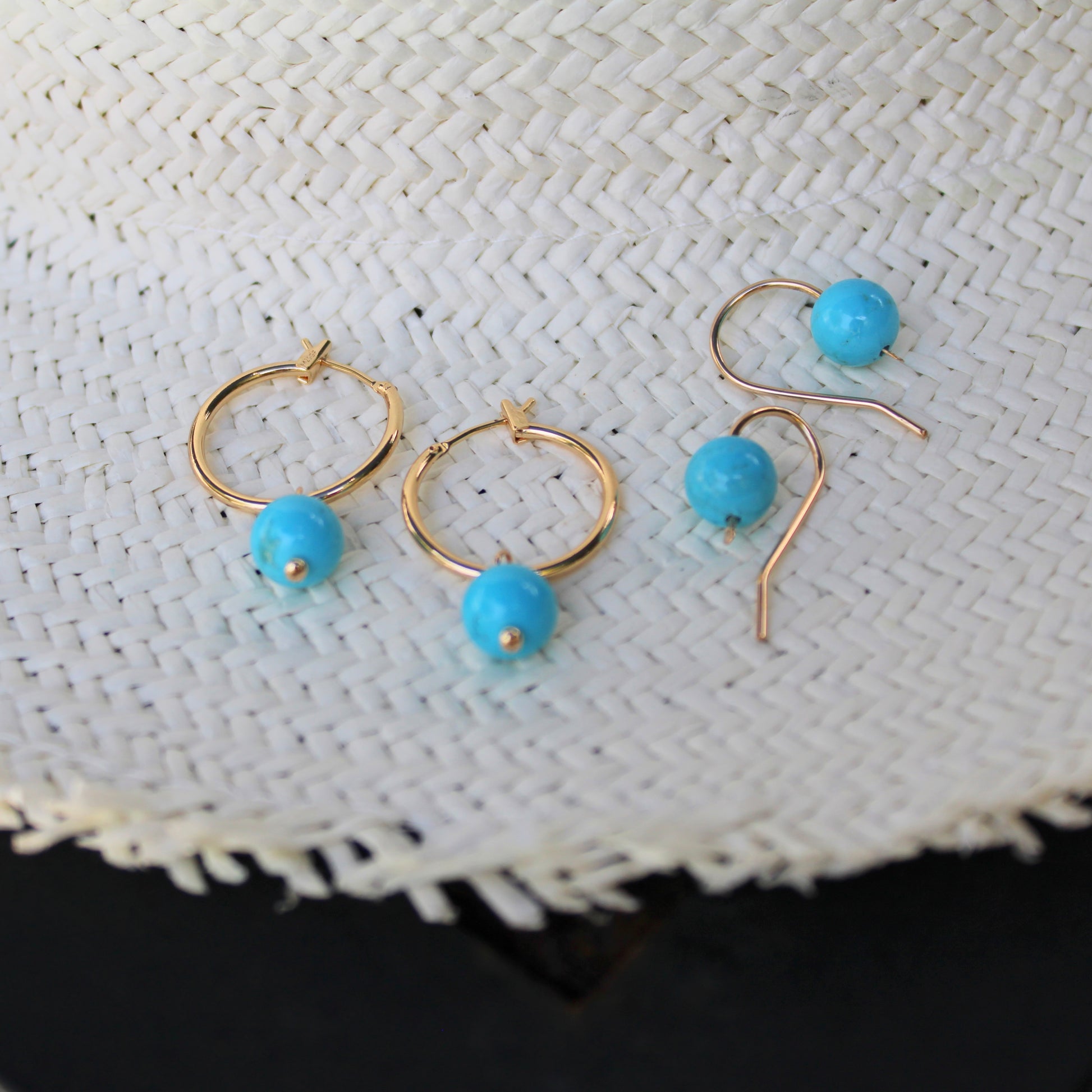 Stunning, natural 8mm turquoise gemstones freely move along 14k gold filled hoops for an effortless, chic look. Slide the turquoise charm off and you have a simple, everyday hoop!