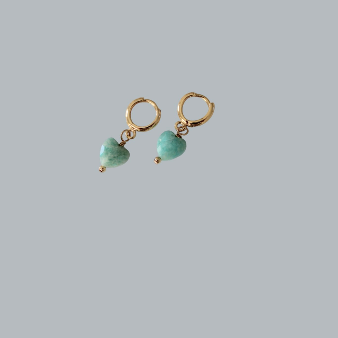 Petite 14k gold filled huggies are paired up with gorgeous seafoam amazonite heart gemstones that are facetted brilliantly.