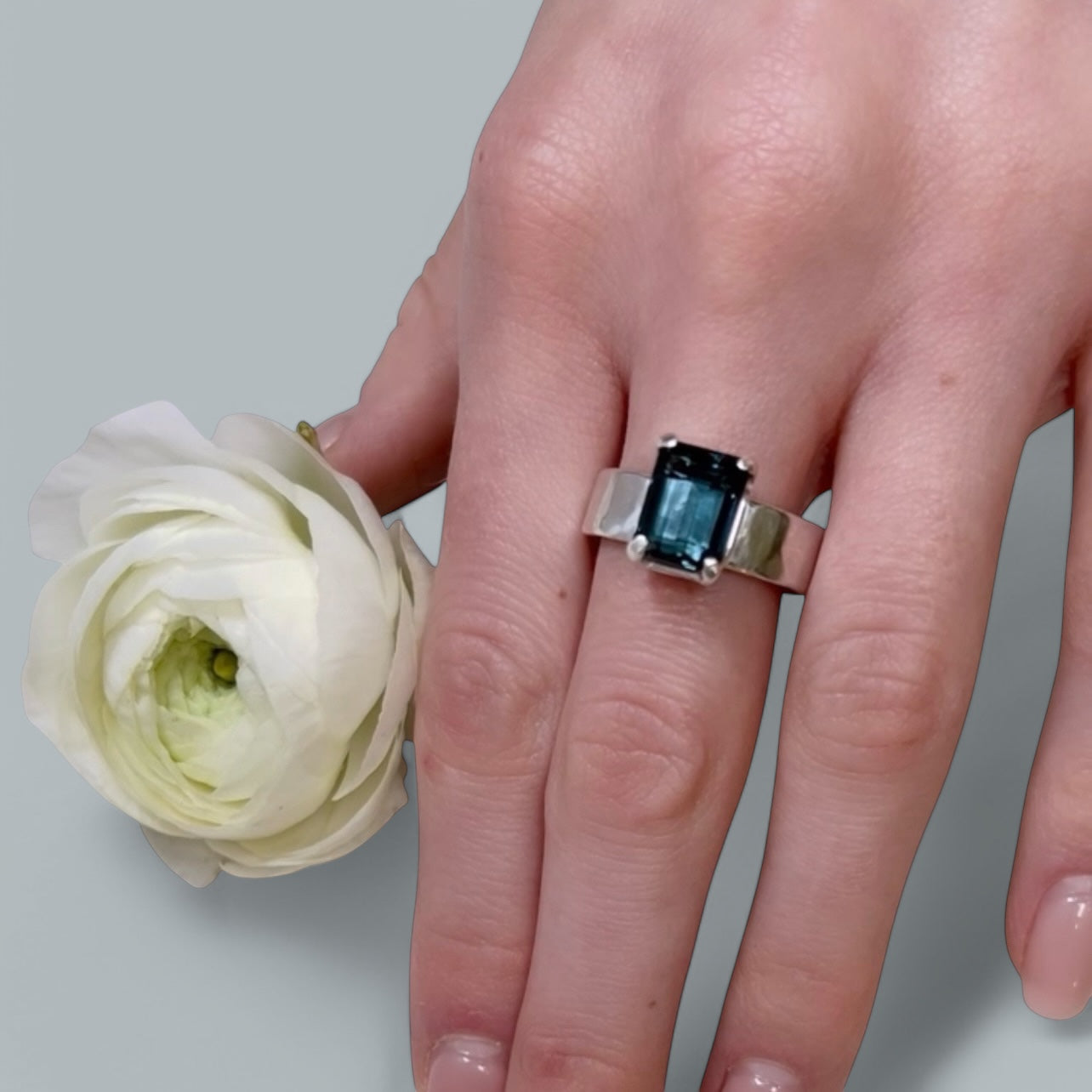 A stunning 8mm x 4mm faceted natural London blue topaz is set in .925 sterling silver and paired with a solid .925 sterling silver band. This ring is simply stunning and can actually be worn as an everyday ring or of course for any special occasion. London blue topaz is the hue of your favorite blue jeans, is very versatile and can be worn with just about anything! Each ring is made to order in the studio and will take 7-14 days to be shipped out.