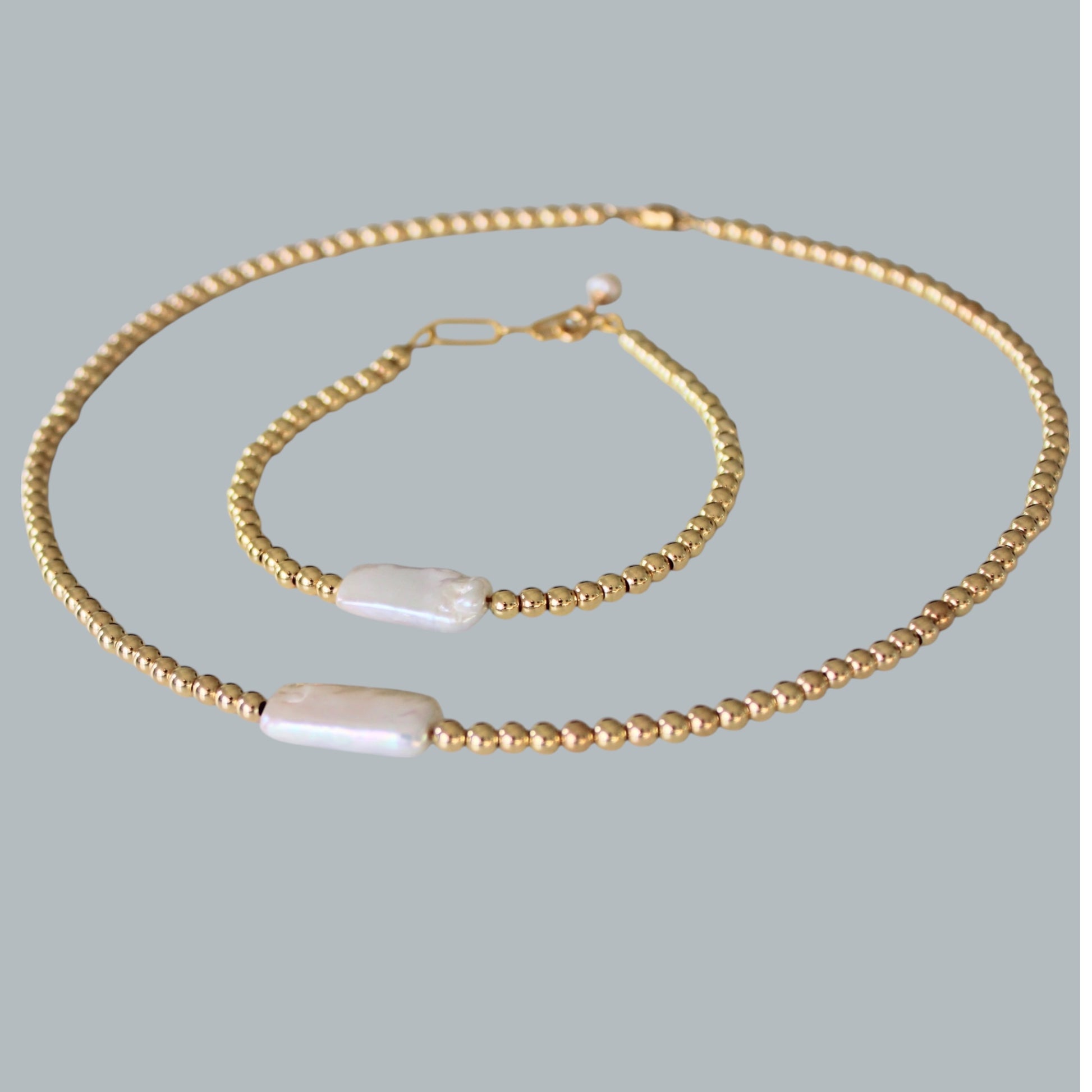 4mm smooth seamless gold beads are paired with a AAA freshwater pearl rectangle “chicklet” pearl.   Pairs beautifully with our matching EFFIE bracelet for a uniform look.