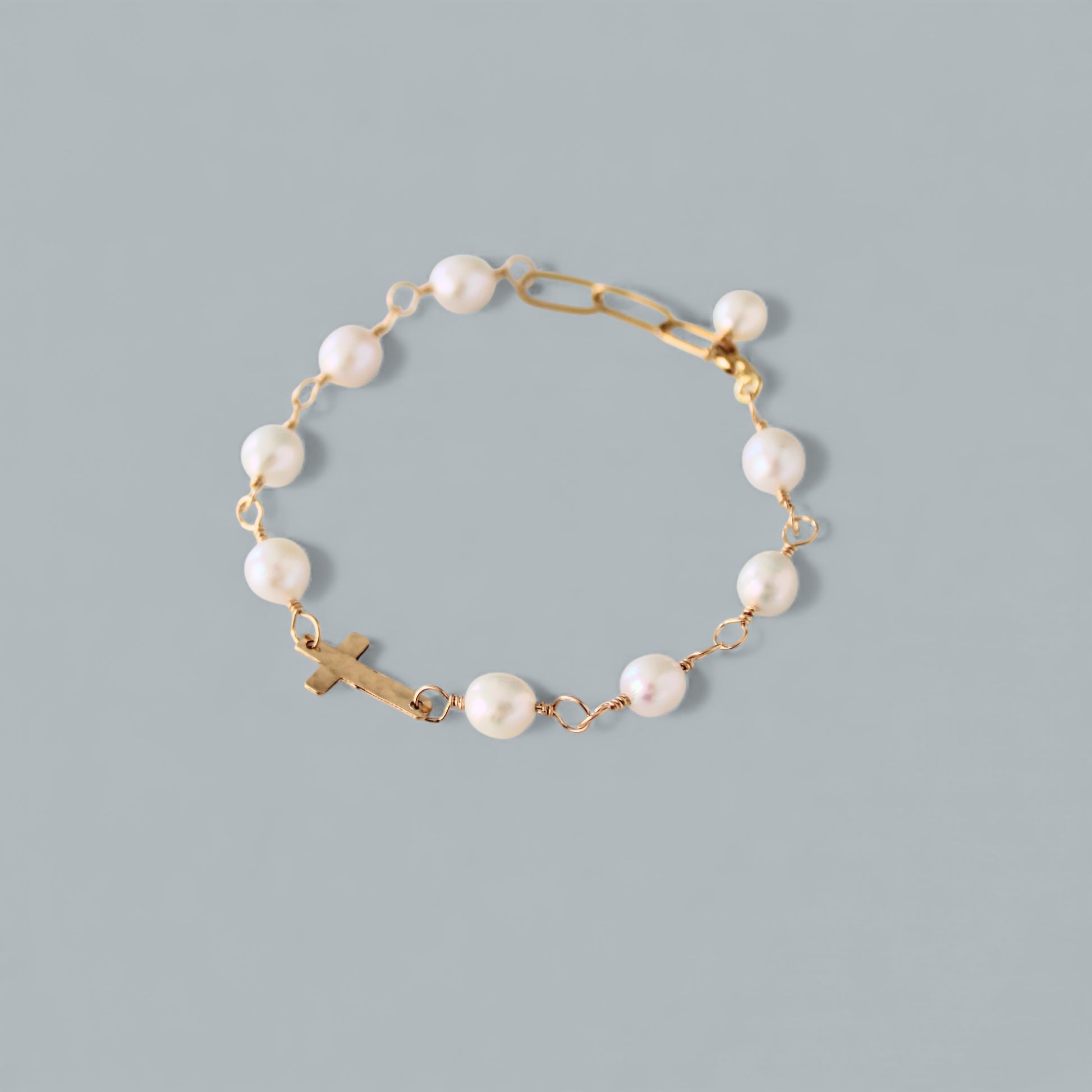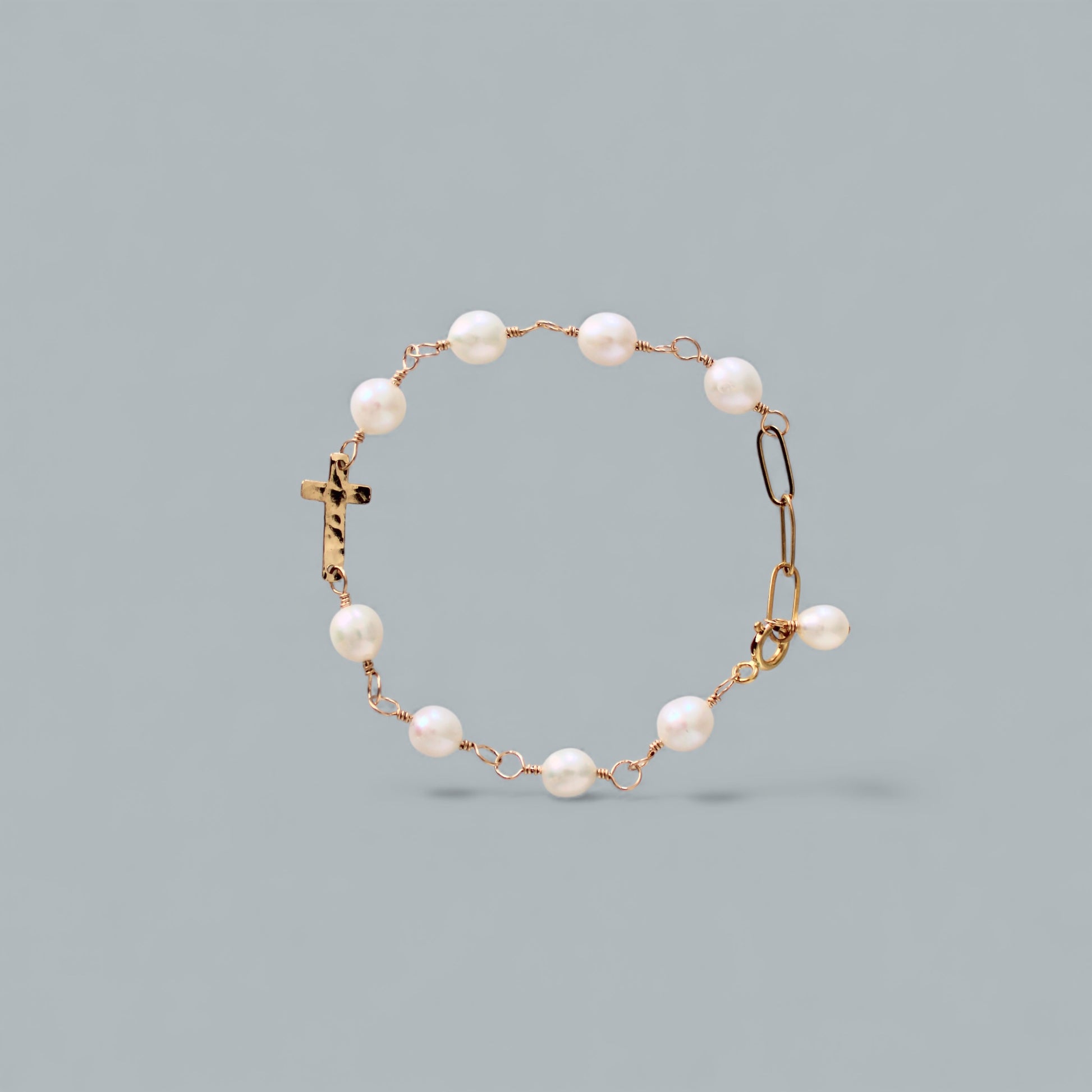 A 14k gold filled hammered cross is hand linked with stunning, white freshwater pearls and enclosed with large paperclip links for an adjustable fit from approximately 7"-8".