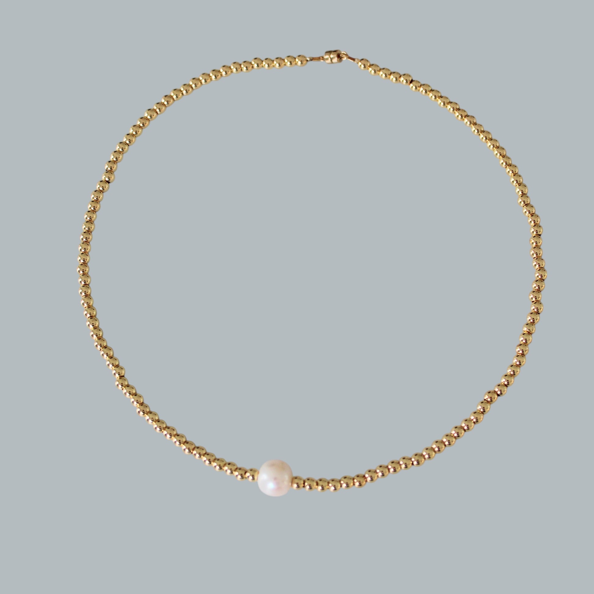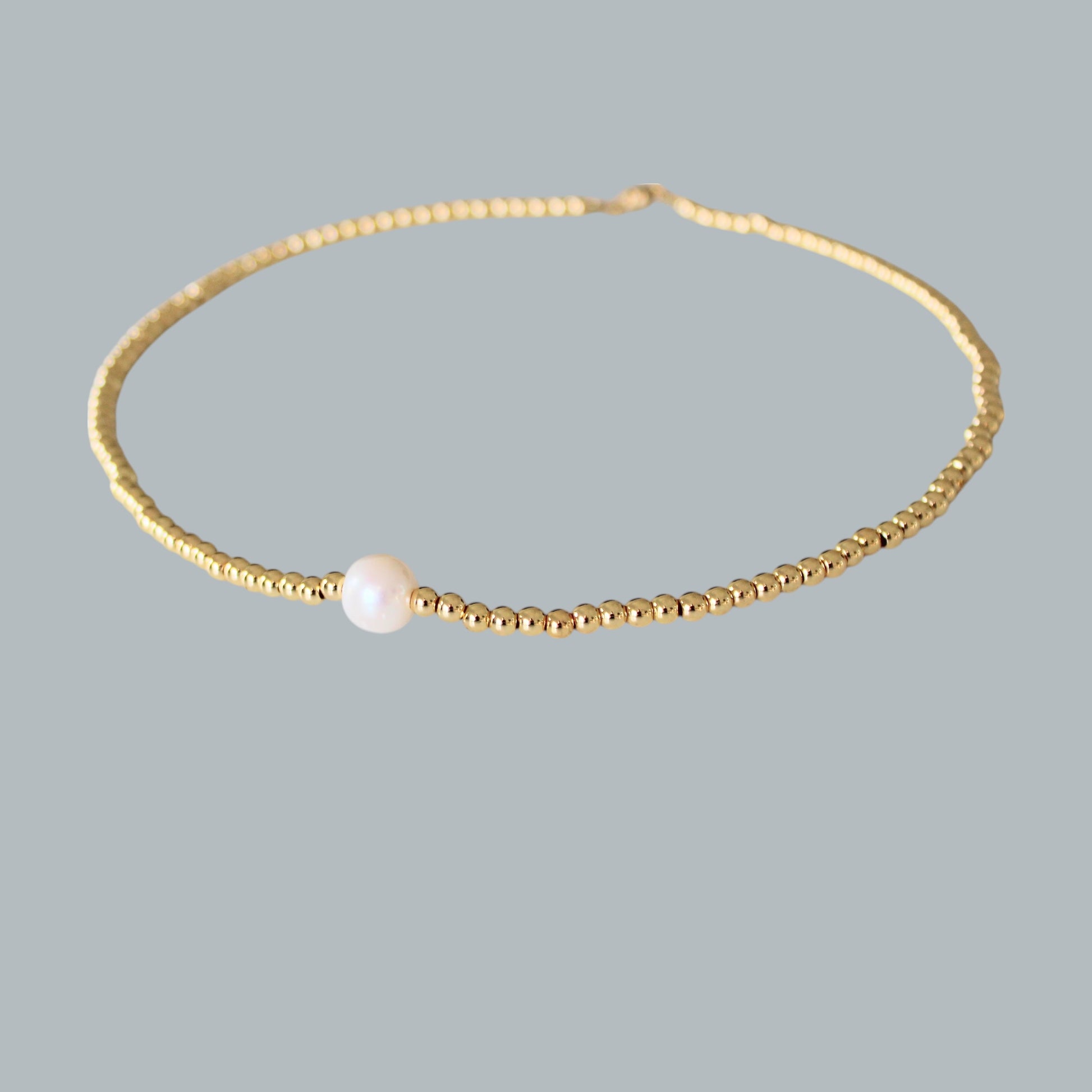 4mm 14k gold filled beads adorned with a single, beautiful freshwater pearl. Magnetic closure for easy on and off. Pairs beautifully with our matching Anderson bracelet.
